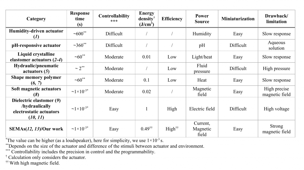 我们的设计可以使得驱动器不在需要特殊的磁场,例如喇叭所需的发射型磁场。因而可以使得驱动器与磁铁进行有效分离。从而我们的机器人在医疗外科手术中可以大展身手,在核磁共振机器在提供驱动器所需强大磁场的同时,相应的成像功能可以为机器人提供导航。这种方法可能在医疗应用领域(如微创医学),利用SEMA替代传统的电磁电机和机器人。在这里,我们提出了几种设计策略和一套方法来制造高性能和全软电磁驱动器,以为软形式的机器人提供动力。现在,我们探索SEMA的六种主要设计策略: