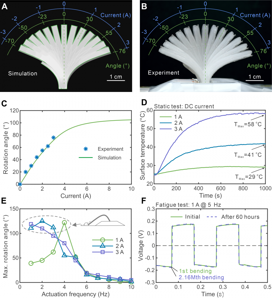 我们采用了实验和模拟两种方式测试了SEMA的性能。图2(A)与(B)首先展示了我们模拟的方法的准确性,同时也展示了结构的基本运动形势,即弯曲。在3A的电流下,结构本身可以发生76度左右的弯曲。通过数值模拟,可以预测出更大电流下的结构弯曲角度(图2(C))。考虑到驱动器运行过程中的焦耳热效应,我们对于SEMA进行了静态热稳定测试(图2(D))。其在长时间1A驱动电流下的温度能稳定在29摄氏度,而在3A电流下温度能稳定在58度。在实际运行过沉重,考虑到结构本身与周围环境的更高效的热交换,在3A交变电流驱动下,结构的稳定温度降到46度。