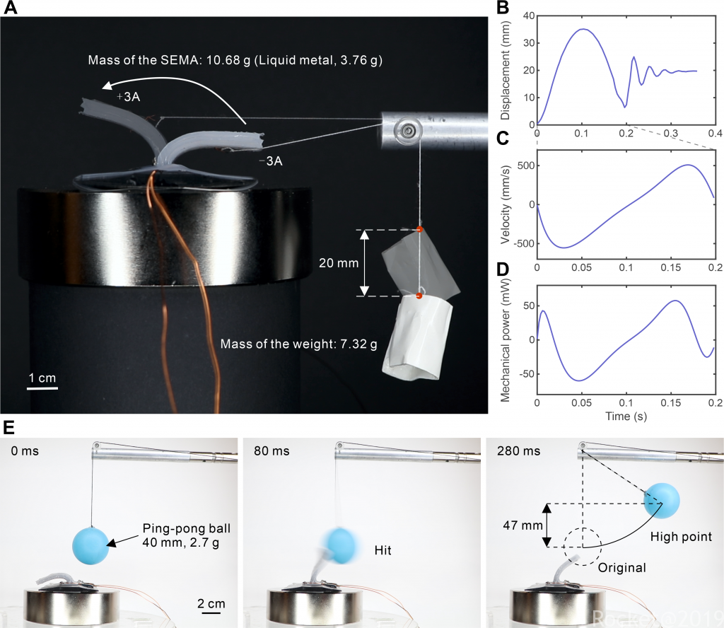 我们还设计了一个测量驱动器功率以及效能的装置如图3(A)所示,通过测量重物的位移,我们可以知道重物的速度以及加速度进而获得驱动器的功率以及效率等信息(图3(B-D))。经过计算,在3A的驱动电流下我们设计的驱动器具有57mW的最大输出能力以及5.3 mW/g的能量输出密度。然而其效率较低,低于1%,绝大部分能量都通过焦耳热效应耗散于环境之中。通过数值模拟,我们展示了通过合理的结构设计,例如减少结构的厚度,其效率可以提高至20%。进一步地在实验中的磁场强度大致在300 mT,而如果提高磁场强度到4T,驱动器的机械效率可以高达90%以上。通过图3(E)我们还进一步展示了驱动器可以用于拍击乒乓球,而如果采用传统电机驱动,所需要的结构显然比较复杂。