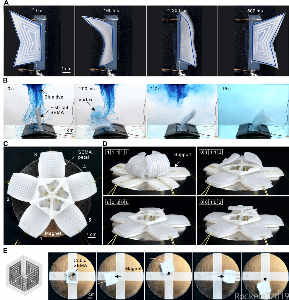SEMA的驱动形式与传统电机不同,其力可以直接作用于物体而不需要通过齿轮、连杆等结构传递。我们设计了如图3 所示的鱼尾结构(图4(A)),并使用其用于混合染料,相对于传统的磁力搅拌器,SEMA的搅拌器的效率更高(图4(B))。进一步地,我们设计了花形SEMA(图4(C)),其由5个可独立控制的SEMA构成。通过编程,其可以实现复杂的构型(图4(D))。实验结果表明,花形SEMA可以实现80 ms 完全闭合或者开启。最后设计了多面体SEMA(图4(E))从而实现了在不同环境中都可以驱动,不存在自锁行为即结构只有面内变形而没有面外弯曲变形。