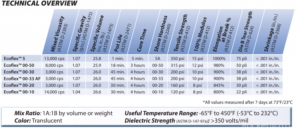 ECOFLEX 00-30 (1:1)3, 000 cps/3 pa-sec1.379Ma1.070.068947 MPa45 min