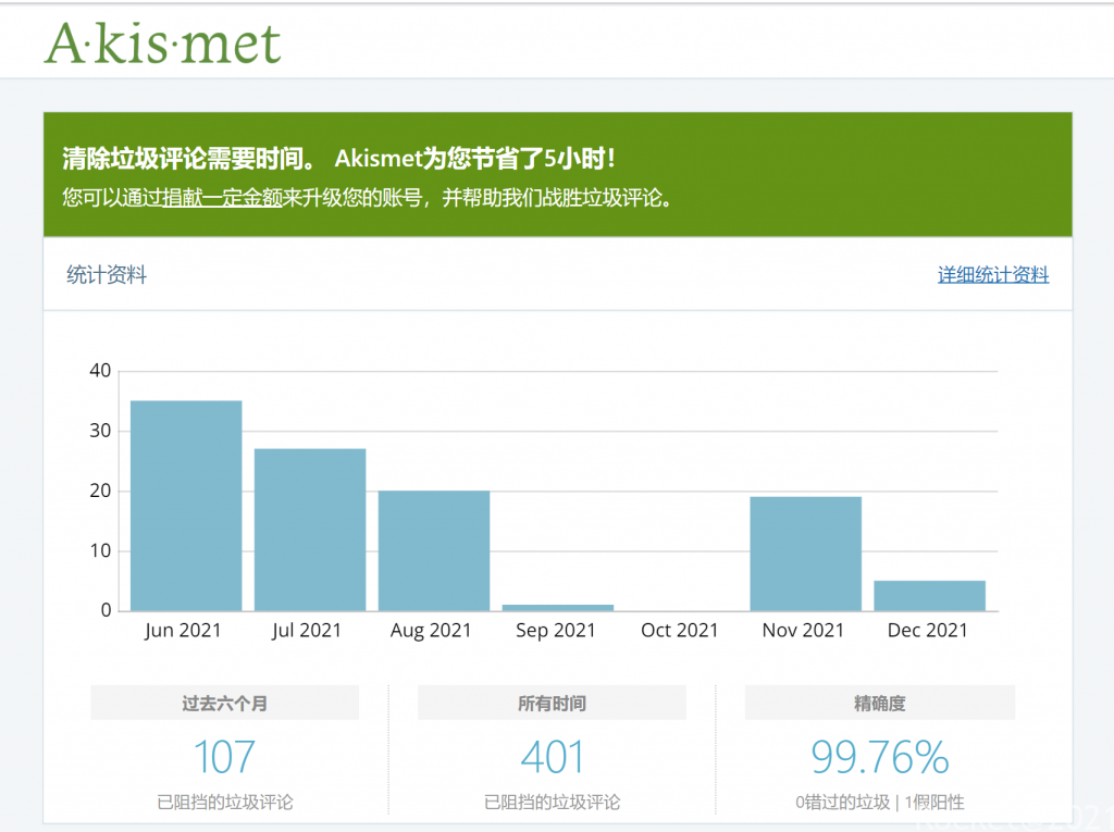 - 首先是插件Akismet,这个可以自动阻止一下显然的垃圾评论。下图是我这个网站的垃圾评论拦截记录。只是这个插件的个人版功能有限,所以还需要另一个插件进行辅助。