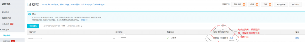 选择列表中的虚拟机->管理->域名管理->域名绑定界面